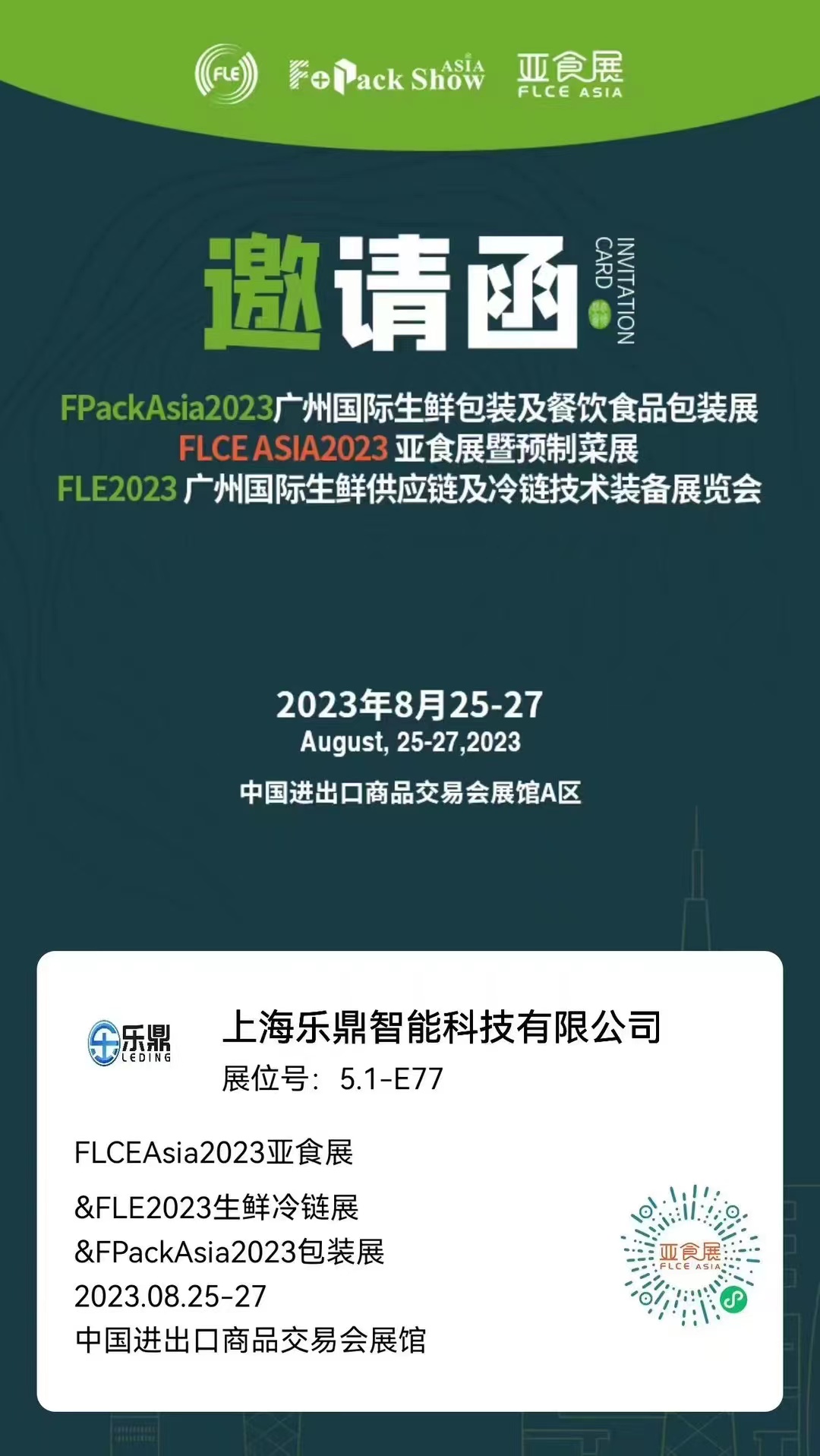 沐鷹智能上海公司(上海樂鼎智能科技有限公司)于8.25-8.27日在廣州廣交會展參加2023FLCEAsia亞食展暨預制菜展,展位號:5.1-E77, 歡迎新老客戶過來現場參觀和指導!